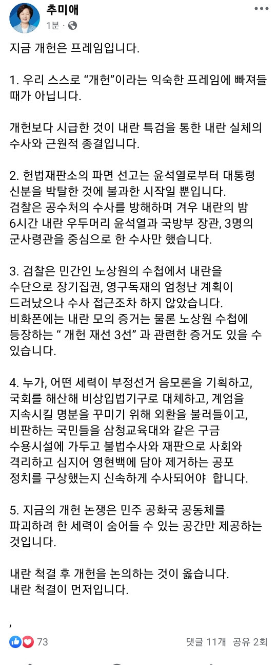 지금 개헌은 프레임입니다 (추미애 2025-04-06) 차례 숨기기 지금 개헌은 프레임입니다 (추미애 2025-04-06) 내용 출처 관련 내용출처https://www.facebook.com/100003216514721/posts/pfbid0GJeuVFLT1h3hhNwj26nPFkeg7yTeQdDN72Vxtp7wqkg9Uhy9pwFegE9As1LdUCNfl/?app=fbl우원식 국회의장 대국민 특별담화 (개헌 논의 2025-04-04)태국 MITH 10주년 광고자영업 5년차 느끼는 실제 자영업400kg 무대장치에 짓눌려 사지마비된 성악가 근황AI에 의해 1순위로 멸망 중이라는 직업군 = 통역사이재명 대통령 ‘마약수사 외압 의혹’에 ‘성역 없이 엄정 수사’ (백해룡 파견) Post Views: 491관련 태그:개헌개헌 프레임지금 개헌은 프레임입니다지금 개헌은 프레임입니다 (추미애 2025-04-06)이전우원식 국회의장 대국민 특별담화 (개헌 논의 2025-04-04)다음난 반댈세 – 개헌 주장 (정청래 2025-04-06)