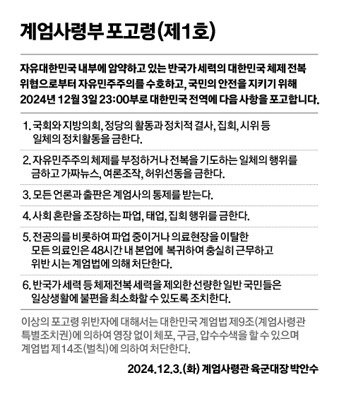 자유대한민국 내부에 암약하고 있는 반국가세력의 대한민국 체제전복 위협으로부터 자유민주주의를 수호하고, 국민의 안전을 지키기 위해 2024년 12월 3일 23:00부로 대한민국 전역에 다음 사항을 포고합니다.