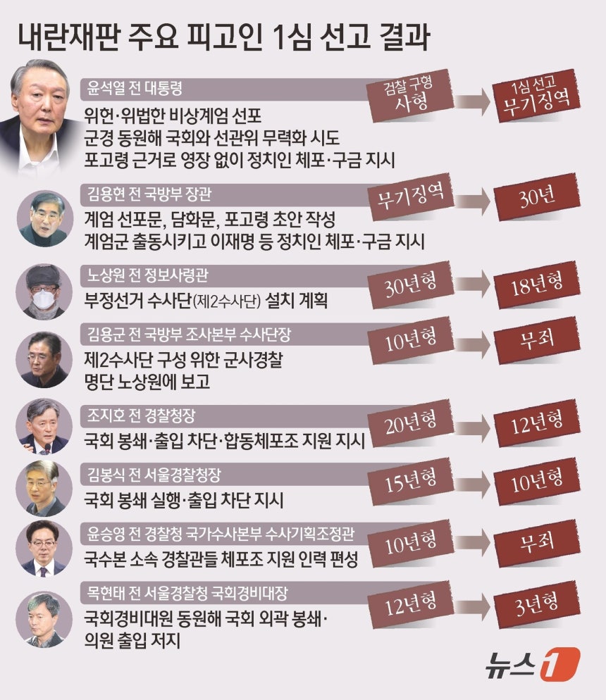 내란재판 주요 피고인 1심 선고 결과 (2026-02-19)