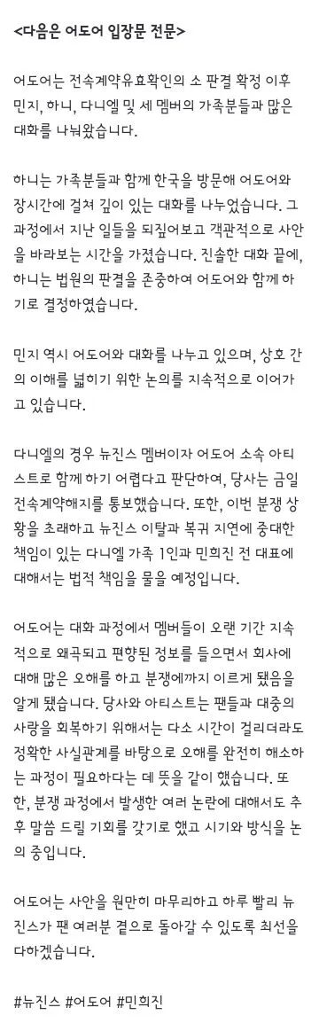 어도어는 전속계약유효확인의 소 판결 확정 이후 민지, 하니, 다니엘 및 세 멤버의 가족분들과 많은 대화를 나눠왔습니다.