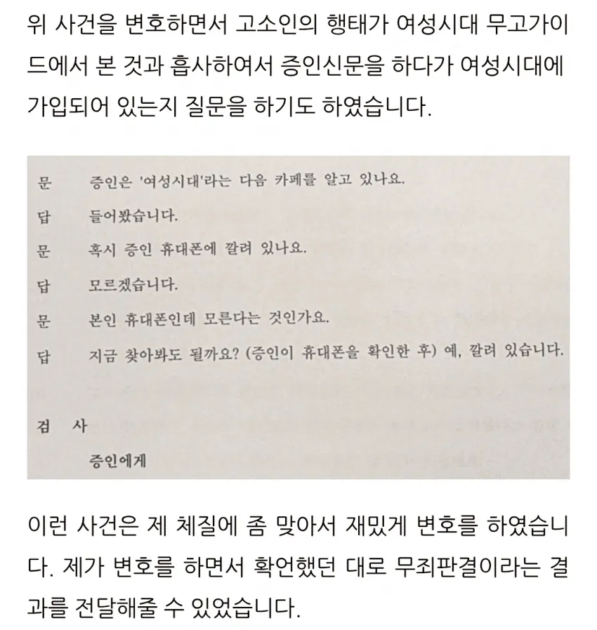 1. 변호사가 성추행 변호하다가 여초 성범죄 무고가이드랑 레퍼토리 똑같아서 여성시대 카페앱 깔려있는걸 법정에서 현장 확인.