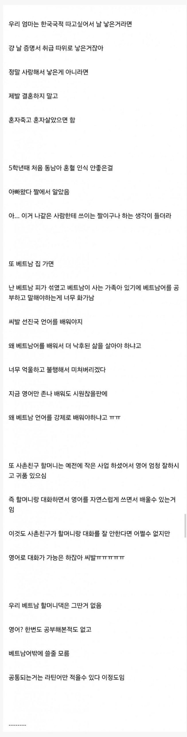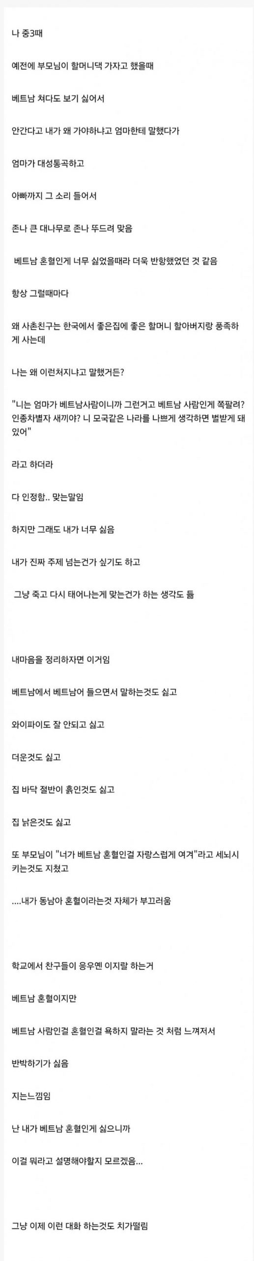 베트남 혼혈이라서 사는 게 고통스럽다 차례 숨기기 베트남 혼혈이라서 사는 게 고통스럽다 관련 베트남 여성이 말하는 연애 현실베트남 혼혈이라서 사는 게 고통스럽다김병주 프로필 (군인 출신 정치인)부승찬 프로필 (정치인 군인 공무원)이완규 프로필 (검사 출신 법조인 제35대 법제처장)여인형 프로필 (비상계엄 내란가담 가담 군인 국군방첩사령관) Post Views: 40관련 태그:베트남 혼혈베트남 혼혈이라서 사는 게 고통스럽다이전김병주 프로필 (군인 출신 정치인)