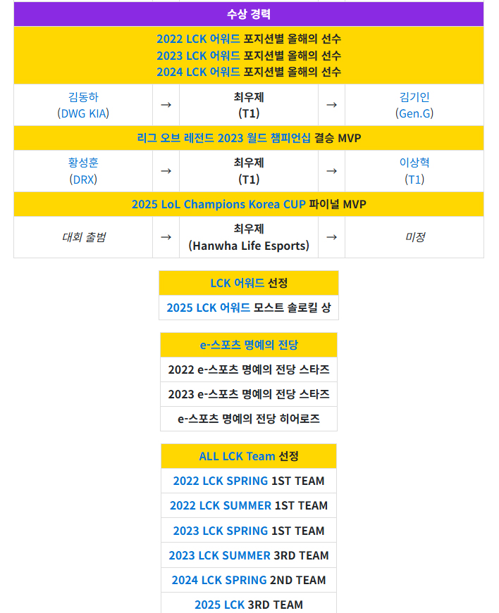 2024년도 기준 현 시점 월즈 2회 우승한 탑라이너 가 되면서 만 20세임에도 불구하고 그 어떤 탑라이너들 보다도 범접하기 어려운 커리어를 쌓아 가장 역체탑에 가까운 선수가 되었다. 참고로, 이 커리어가 아직 데뷔 3년차라는 점이 무서운 부분이다.