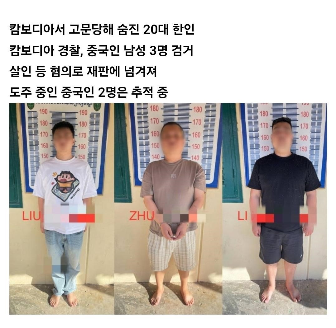 캄보디아에서 발생한 한국인 대학생 사망 사건과 관련해, 중국인 3명이 살인 혐의로 현지에서 검거되어 재판에 넘겨졌습니다. 이들은 한국인 대학생이 고문을 받고 숨진 현장에서 체포되었으며, 시신에서는 감금과 고문의 흔적이 발견되었습니다.