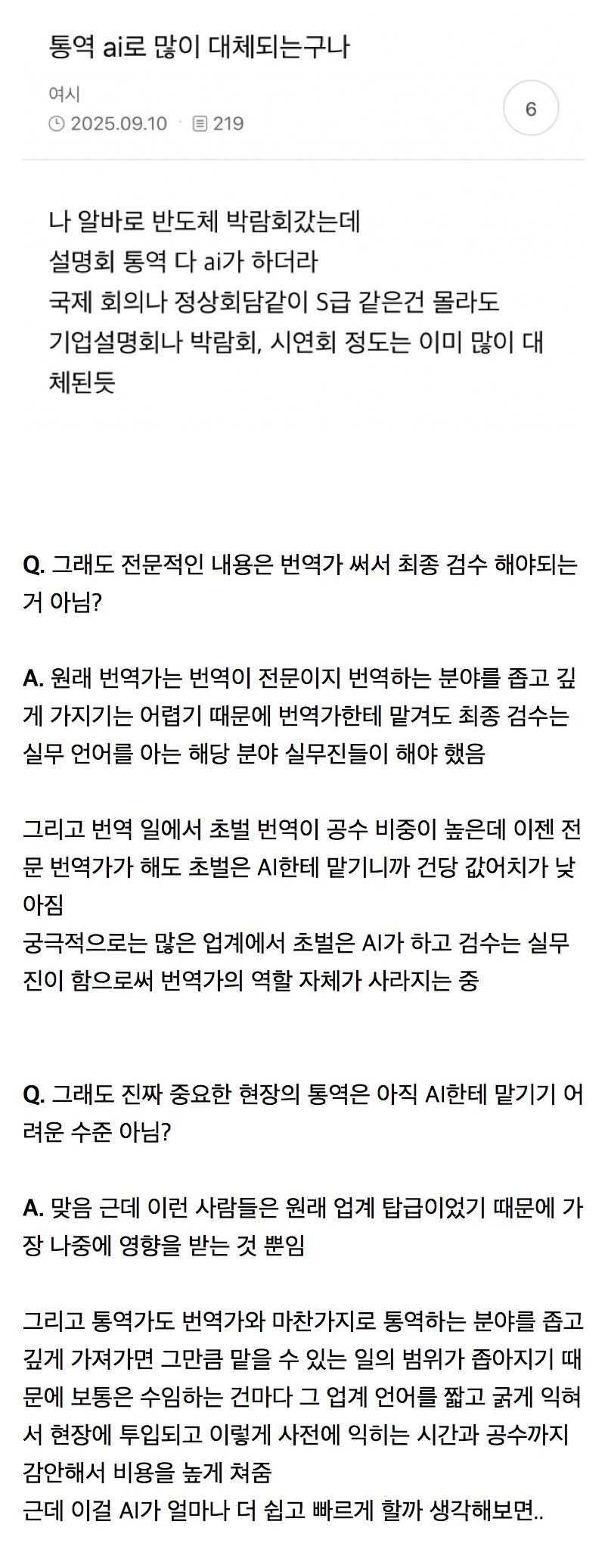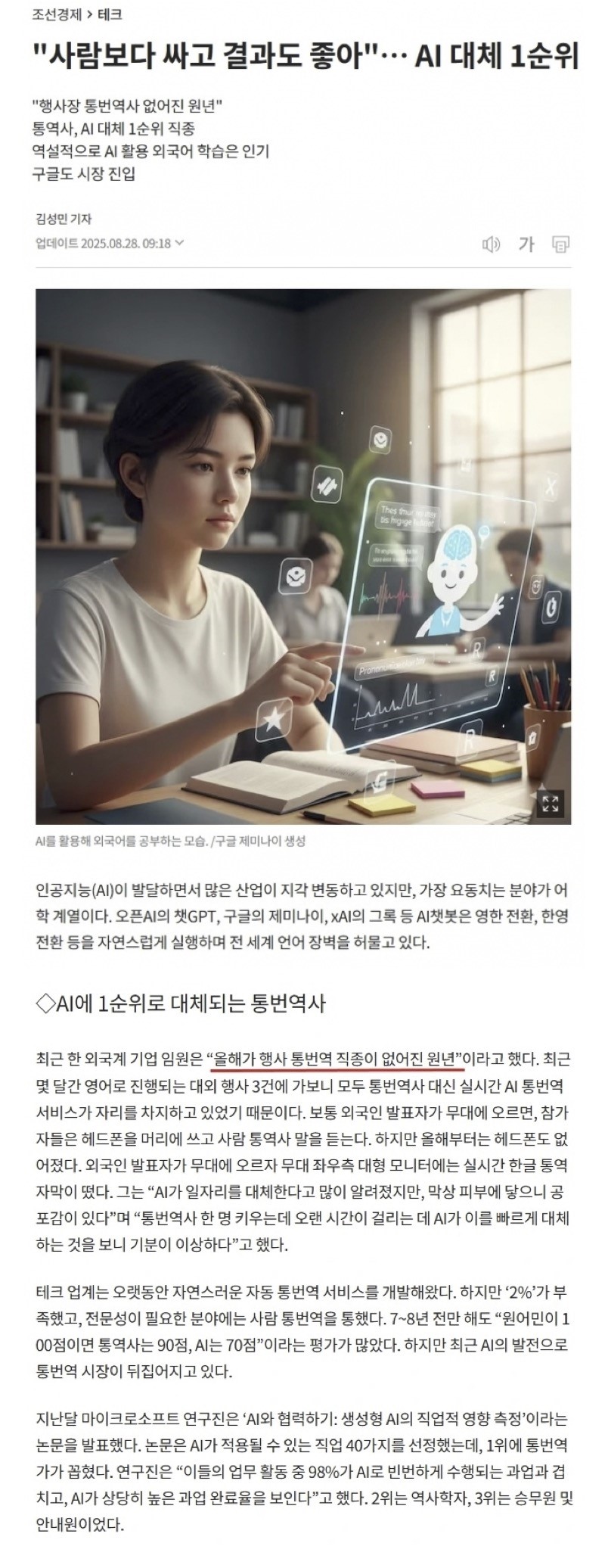 AI에 의해 1순위로 멸망 중이라는 직업군 = 통역사 차례 숨기기 AI에 의해 1순위로 멸망 중이라는 직업군 = 통역사 관련 10년 전 예상한 인공지능으로 대체될 직업태국 MITH 10주년 광고자영업 5년차 느끼는 실제 자영업400kg 무대장치에 짓눌려 사지마비된 성악가 근황AI에 의해 1순위로 멸망 중이라는 직업군 = 통역사이재명 대통령 ‘마약수사 외압 의혹’에 ‘성역 없이 엄정 수사’ (백해룡 파견) Post Views: 195관련 태그:AI에 의해 1순위로 멸망 중이라는 직업군AI에 의해 1순위로 멸망 중이라는 직업군 = 통역사통역사이전이재명 대통령 ‘마약수사 외압 의혹’에 ‘성역 없이 엄정 수사’ (백해룡 파견)다음400kg 무대장치에 짓눌려 사지마비된 성악가 근황